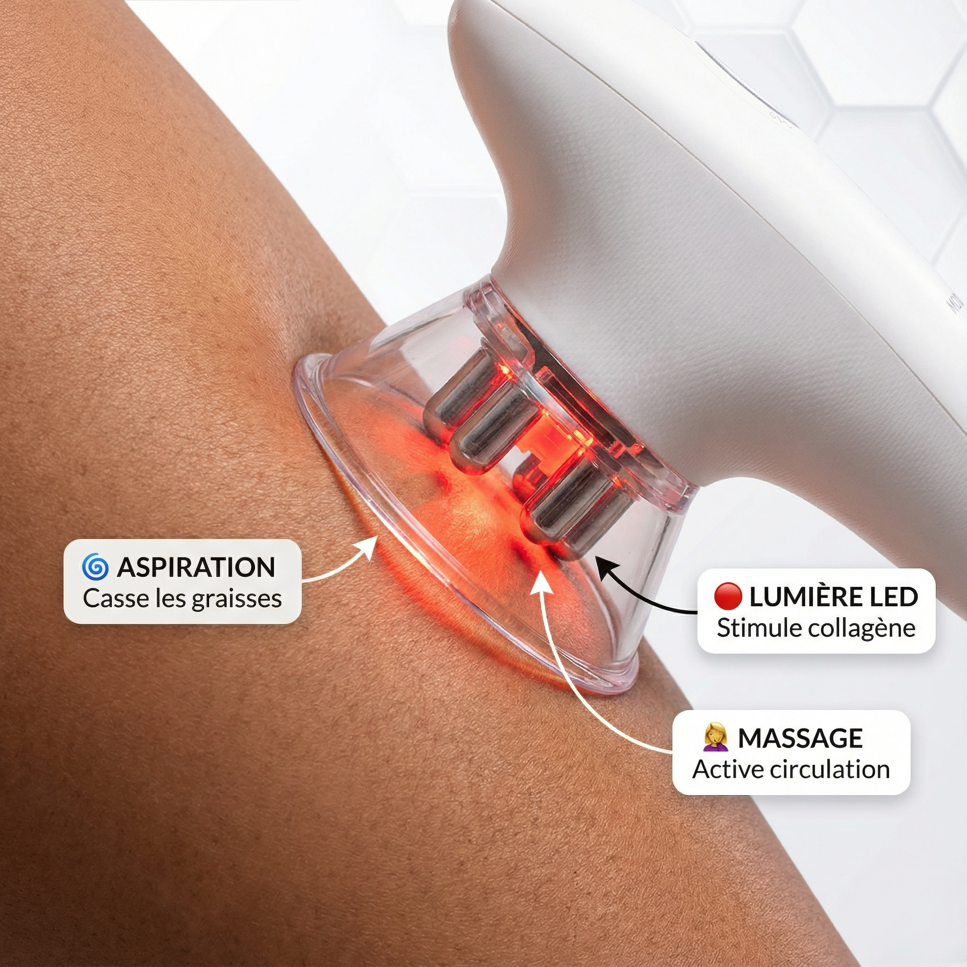 C’est un appareil de soin du corps à domicile, utilisant l’aspiration, la lumière rouge et un massage en profondeur pour réduire la graisse et raffermir la peau.